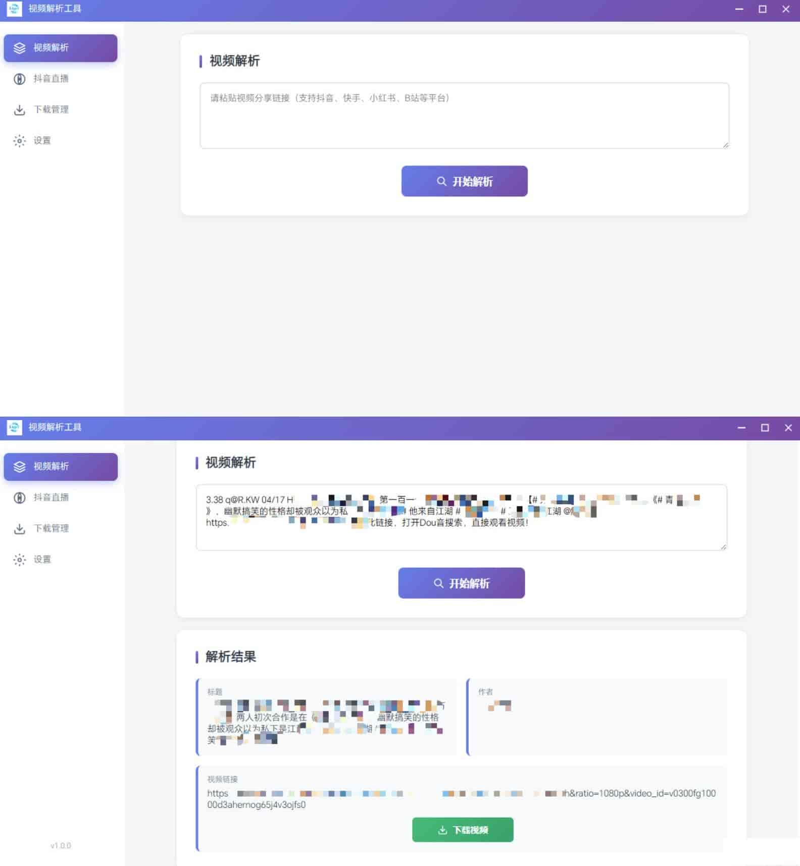 打开软件,在输入框右键粘贴链接,点击”开始解析”按钮