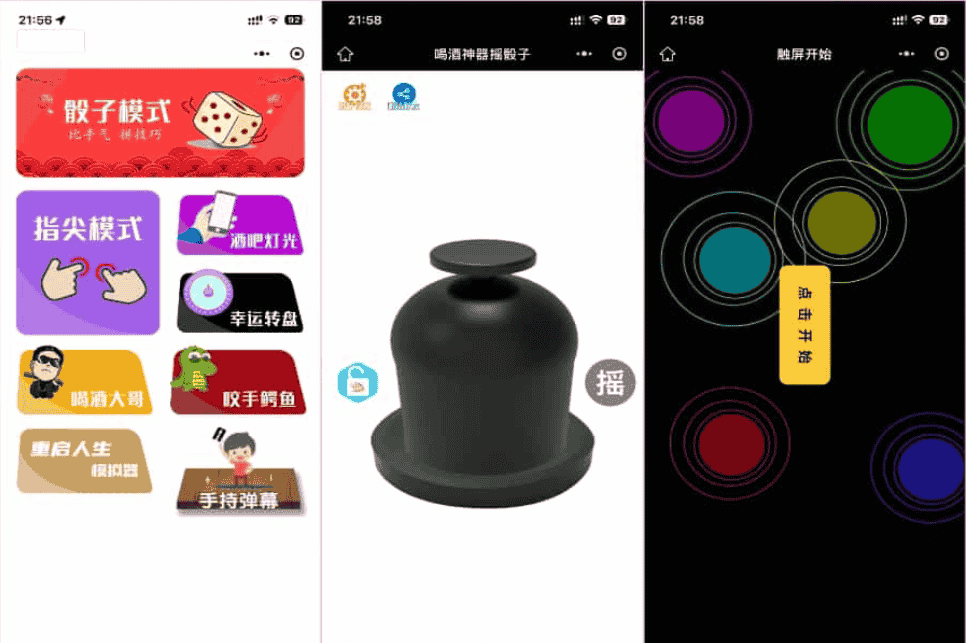 聚会娱乐类微信小程序,专为喝酒、聚会场景设计,集成了多种互动游戏和娱乐工具。