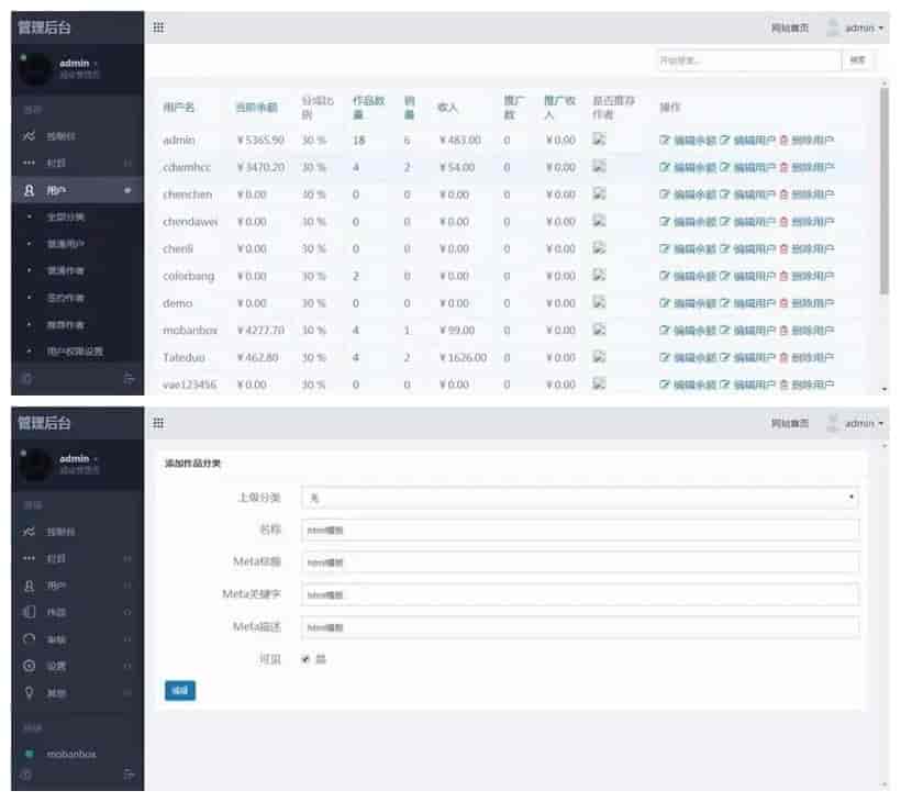 源码说明本套系统主要用于资源站点,共有两种角色,作者与下载用户,作者可以发布自己的作品,用户可以自由下载,后台和用户页面有详细的交易记录,系统功能强大全面,无加密无后门,内置支付宝接口,并且支持移动端。测试环境:Linux+nginx1.14.2+PHP5.4+MySQL5.5.62-log