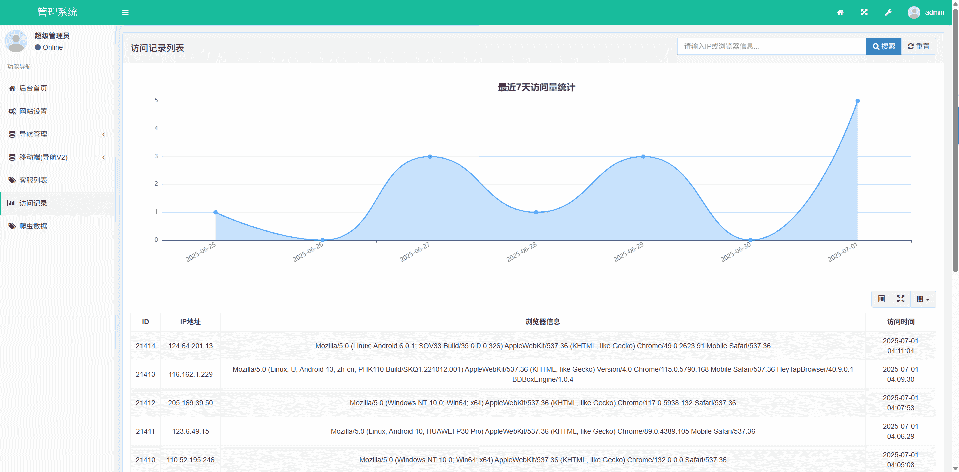 首页带轮番图设计,支持分类跳转和下载功能,后台带有用户访问记录,下载区域可展示软件/资源信息,功能和页面都非常不错