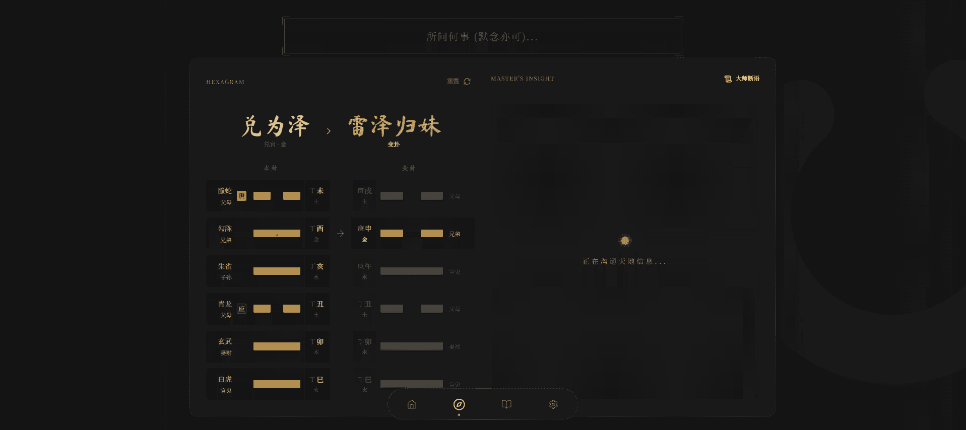 功能完整:支持手动指定卦式、时间自动排盘,涵盖感情/事业/财运等占问事项,展示本卦、变卦、六亲、伏神等信息;