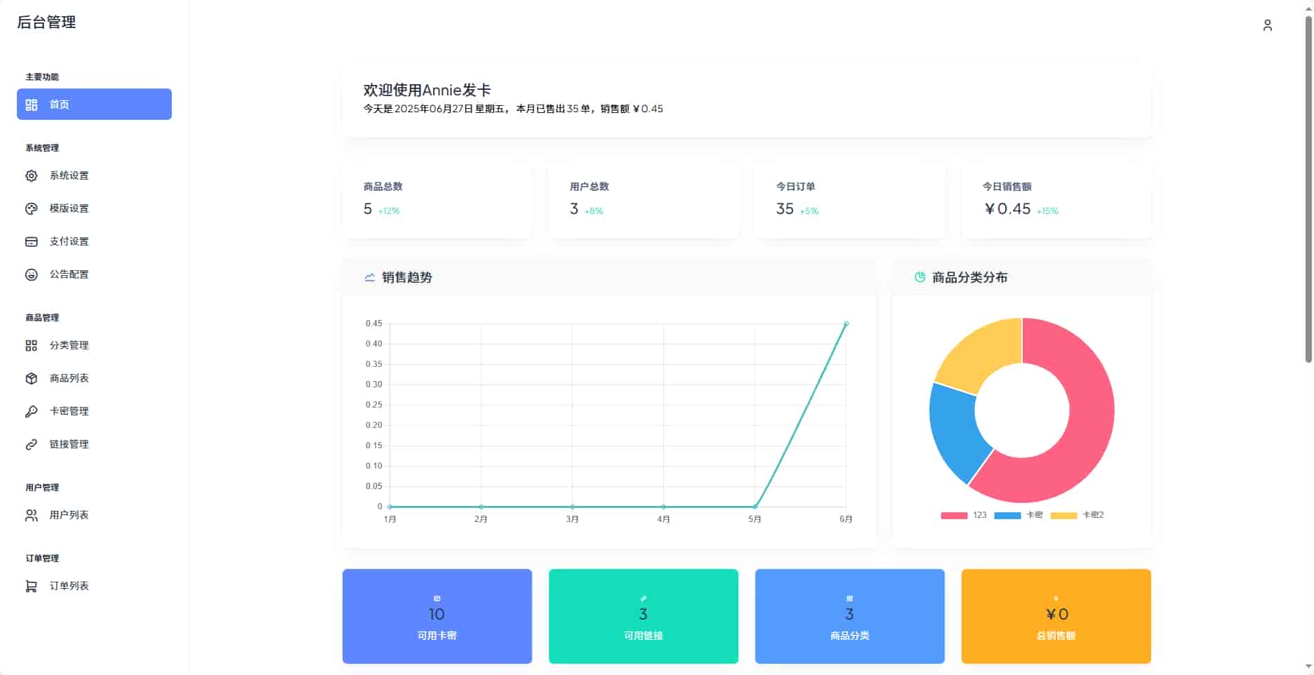 Annie发卡系统是一个功能完善的在线资源销售平台,专为数字商品、卡密、链接等虚拟产品的销售而设计。系统采用现代化的Web技术架构,提供完整的电商解决方案,包括前台销售、后台管理、用户中心、支付集成等核心功能。