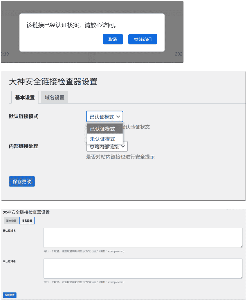 WP 链接检测插件是一款 WordPress 安全增强工具,可对网站超链接进行安全状态检查并提供用户提示。插件通过管理界面允许网站管理员配置默认验证模式(已认证 / 未认证)、设置信任和不信任域名列表,以及控制是否对内部链接进行检查。当用户点击外部链接时,插件会拦截跳转并显示相应提示,告知用户链接的安全状态,帮助减少钓鱼风险和提升用户体验。插件支持多标签设置界面,提供了简洁的对话框样式,并通过 JavaScript 实现了平滑的交互效果。
