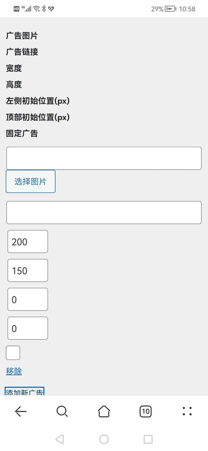 后台可上传本地图片、设置大小、链接和初始位置,广告可在网页上浮动,鼠标悬停暂停,