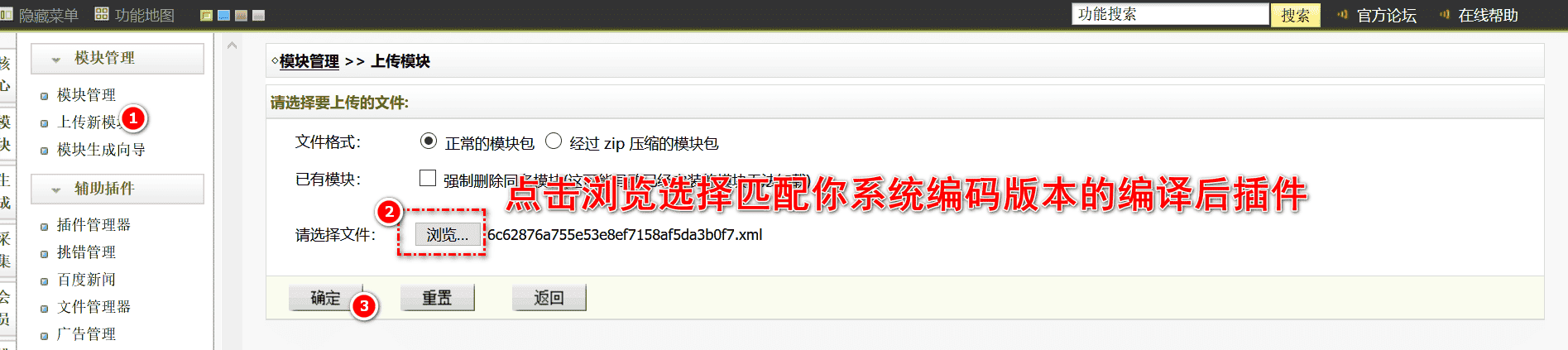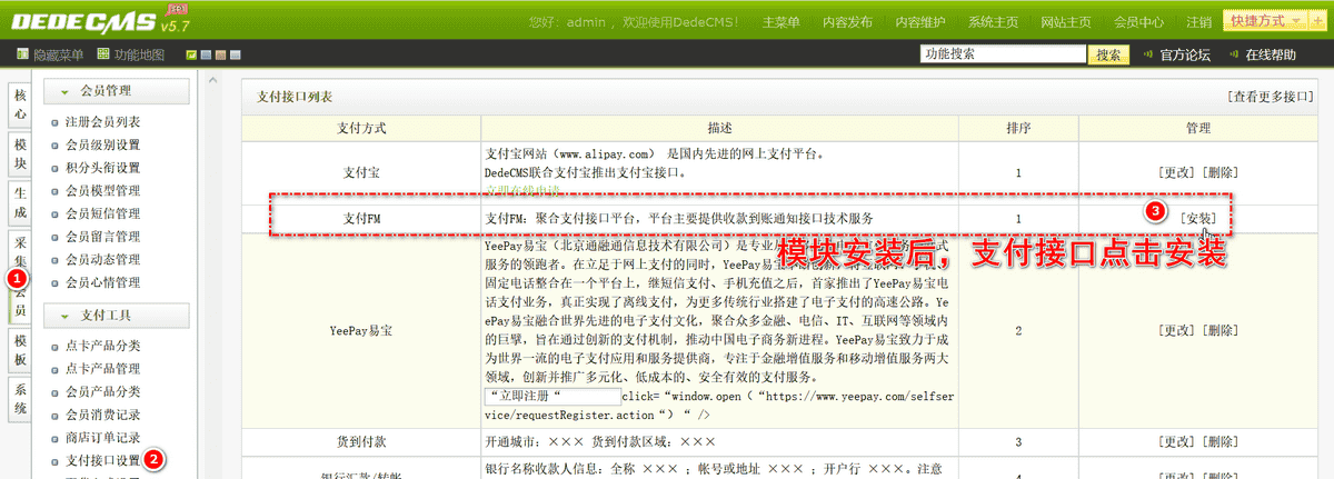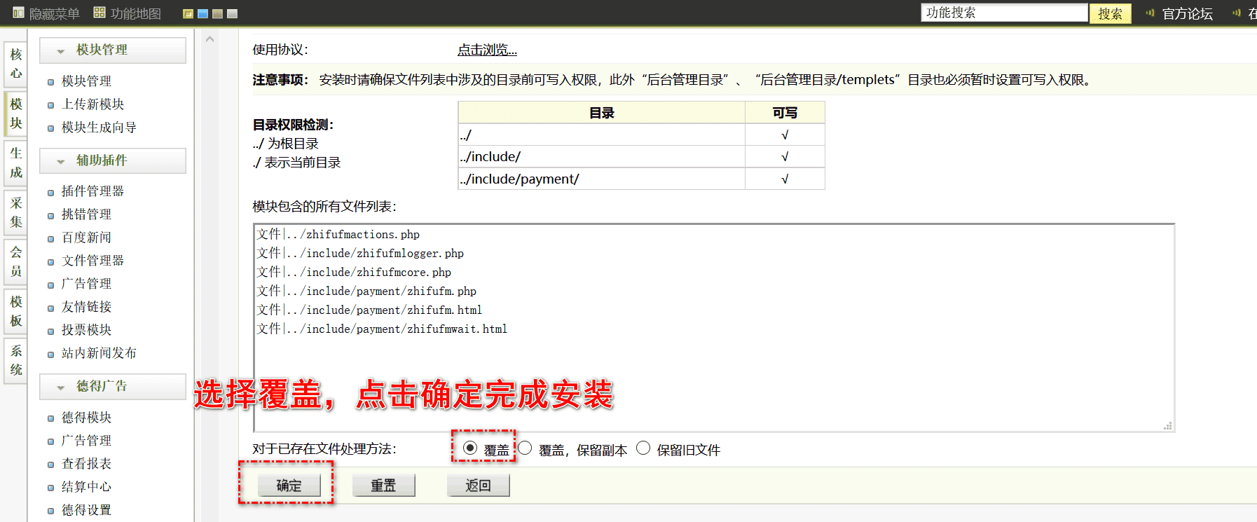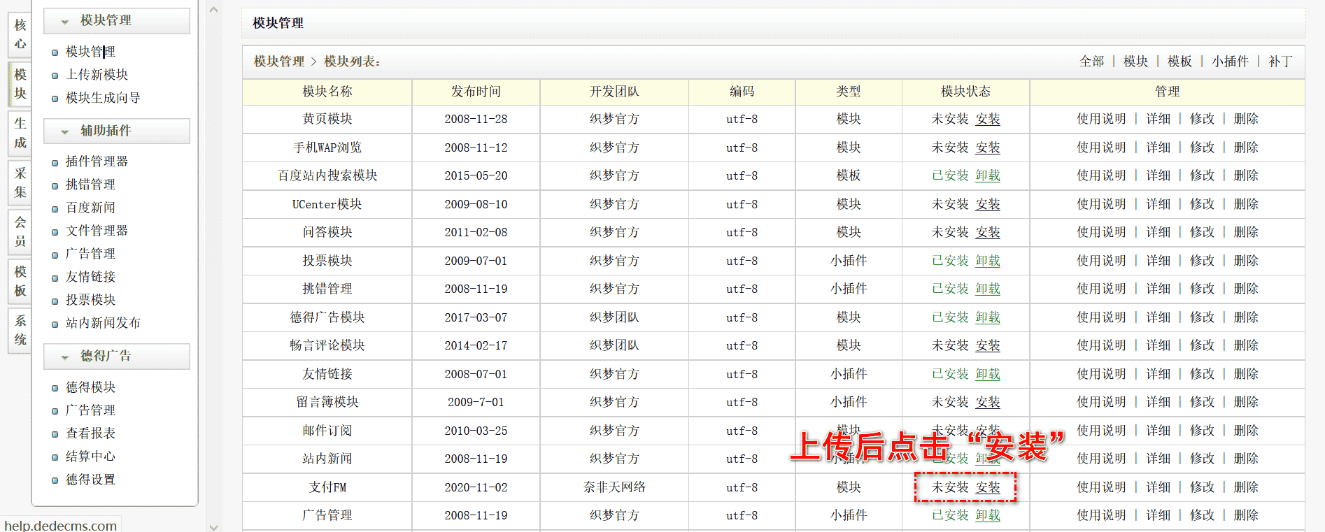 二、安装模块点击模块管理中模块,点击安装。(有些站长的模块管理为空,可以百度修复,这种属于dedecms非常常见的问题了。)