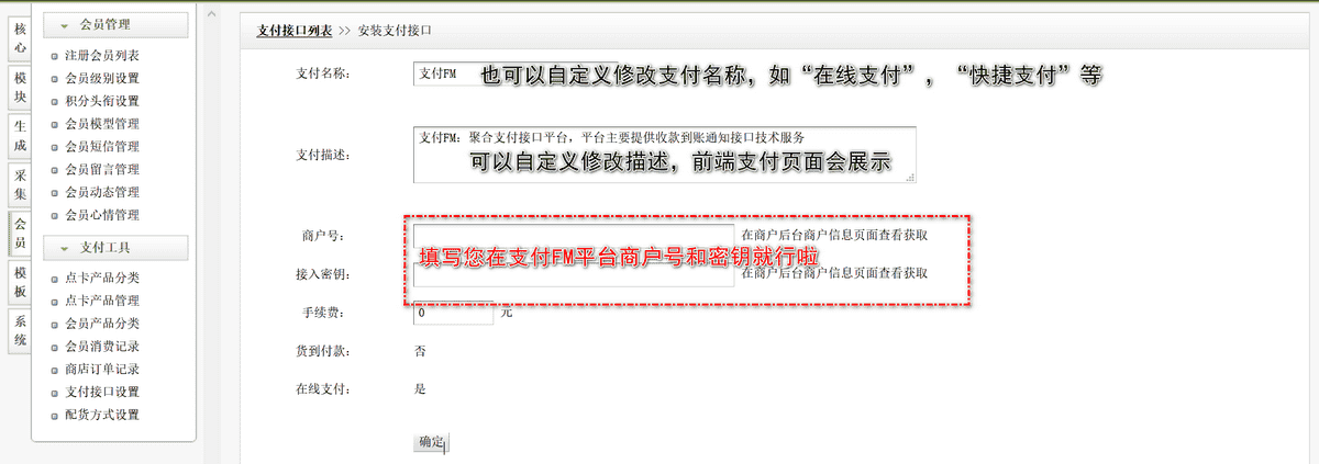 安装时候配置或者安装完成后点击修改配置,然后设置商户号和密钥。