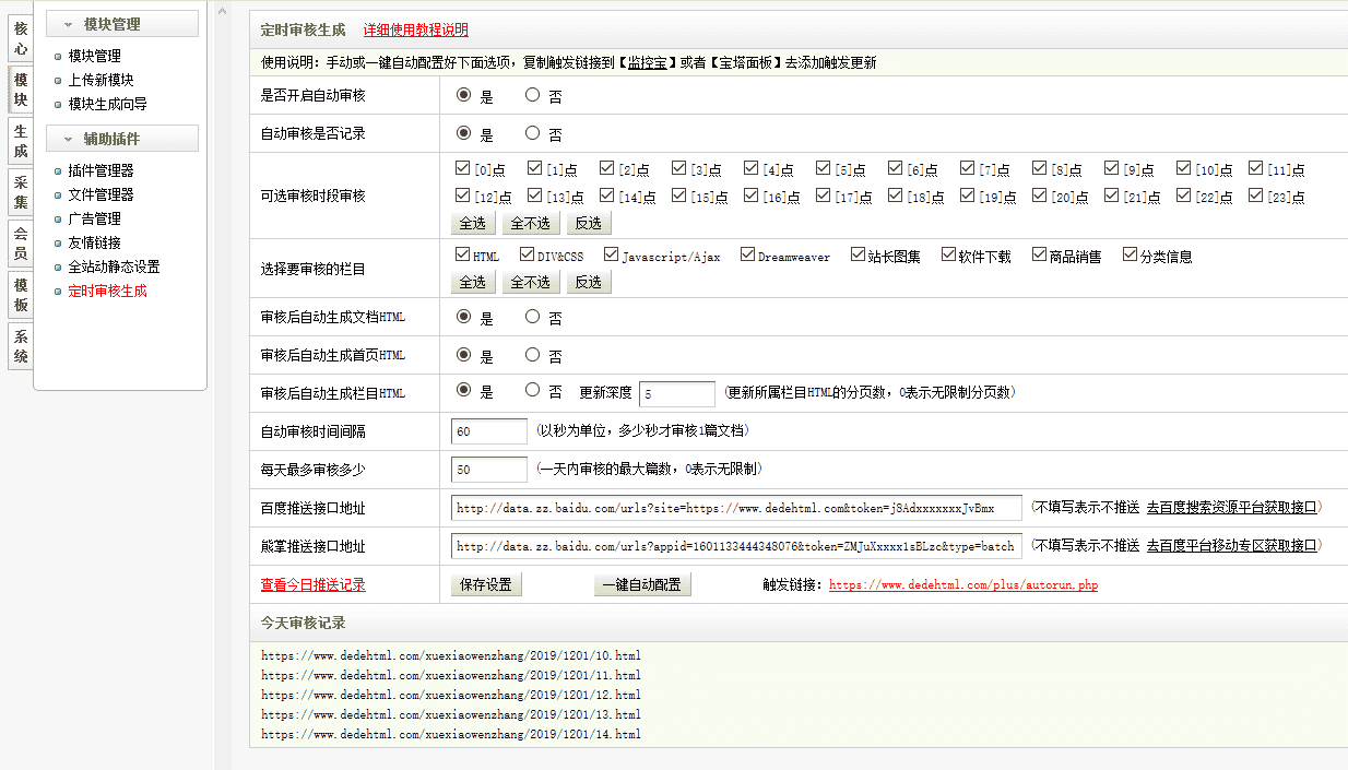 织梦定时定量自动审核并更新HTML和自动推送插件。