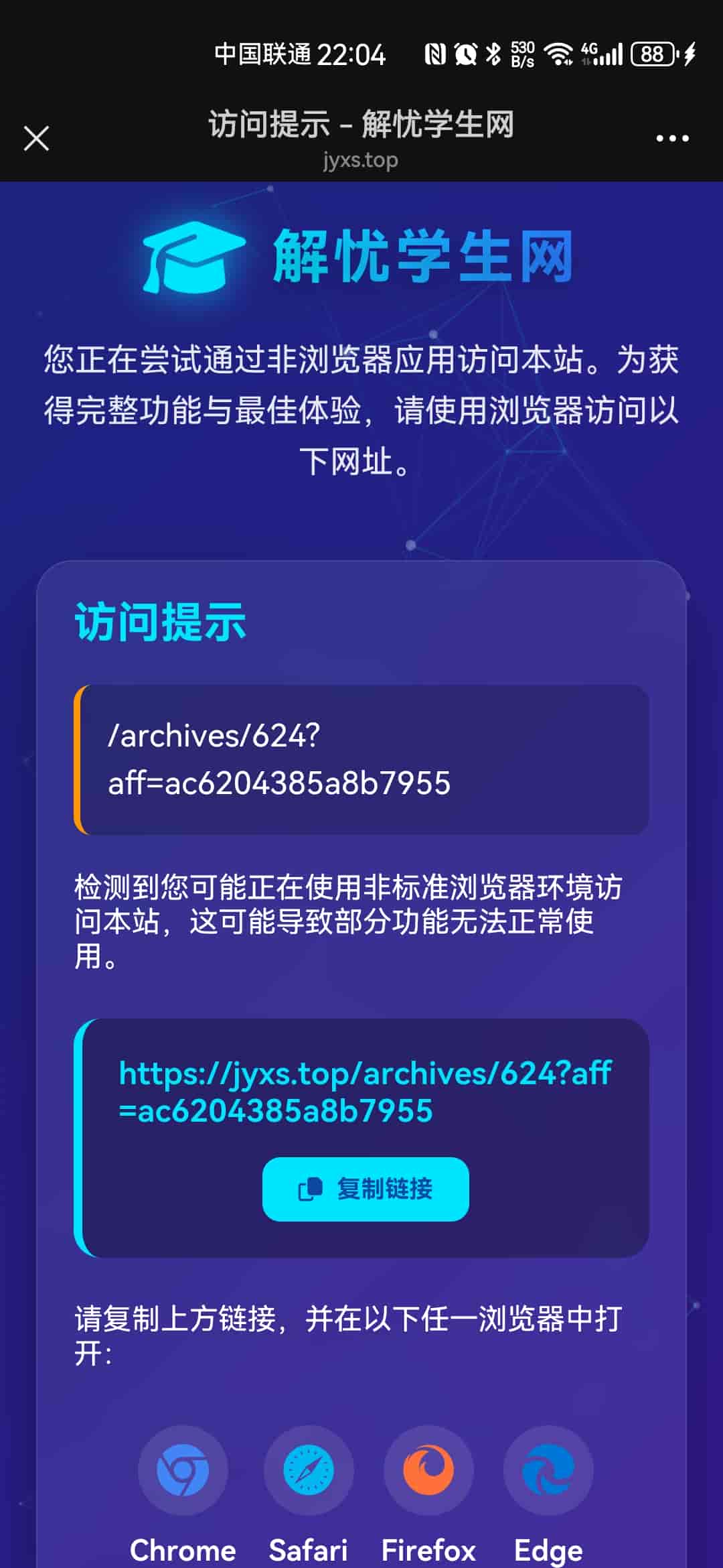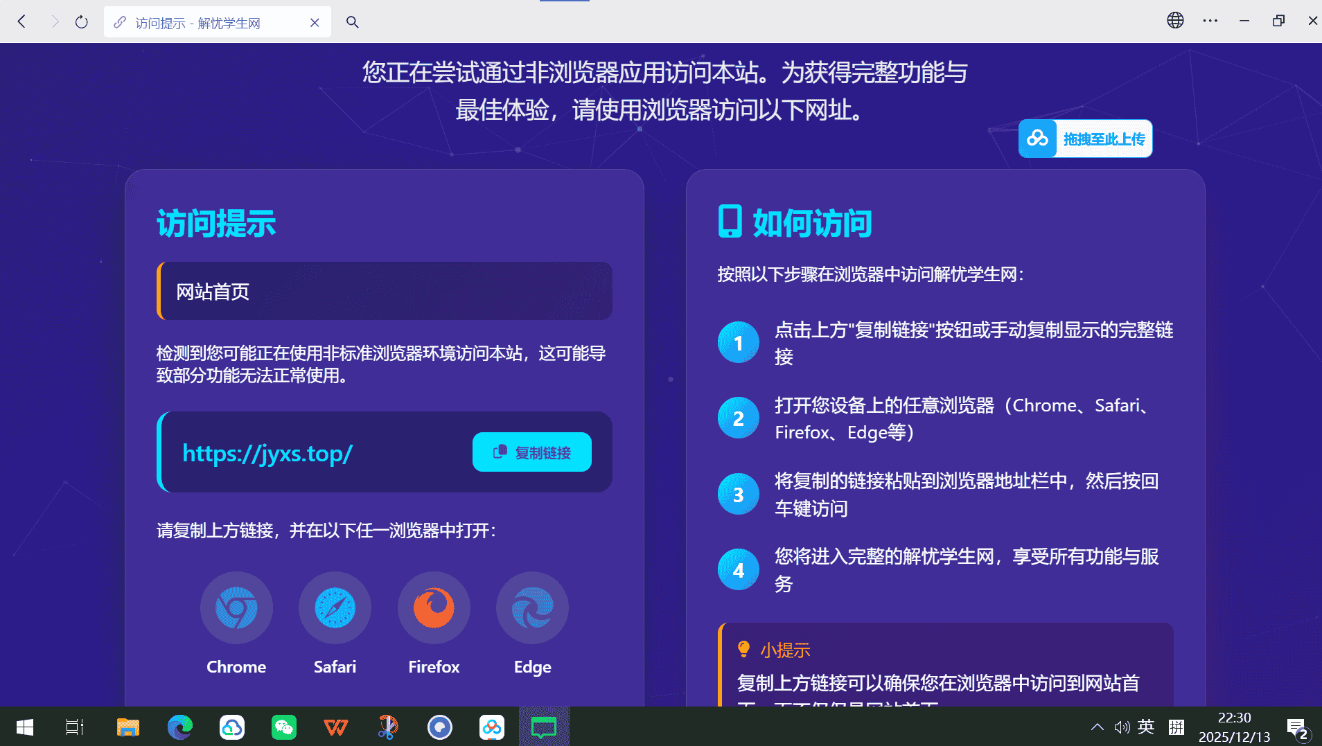 采用动态拦截技术,获取拦截前用户访问的网址,并且传参到拦截页面,可以做到用户通过什么子链接访问网站,只要是微信QQ访问,均会重定向到拦截网页,并显示复制链接到浏览器打开访问,且复制的链接采用动态获取拦截前用户访问的原网址,该拦截代码为解忧学生网亲测原创现在公开给大家学习使用。下面是测试图片。开箱即用。附带教程