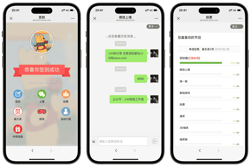 功能:签到、3D签到、投票、幸运号码、幸运手机号、对对碰、相册、开幕墙、闭幕墙、红包雨、瑶大奖、游戏等等
