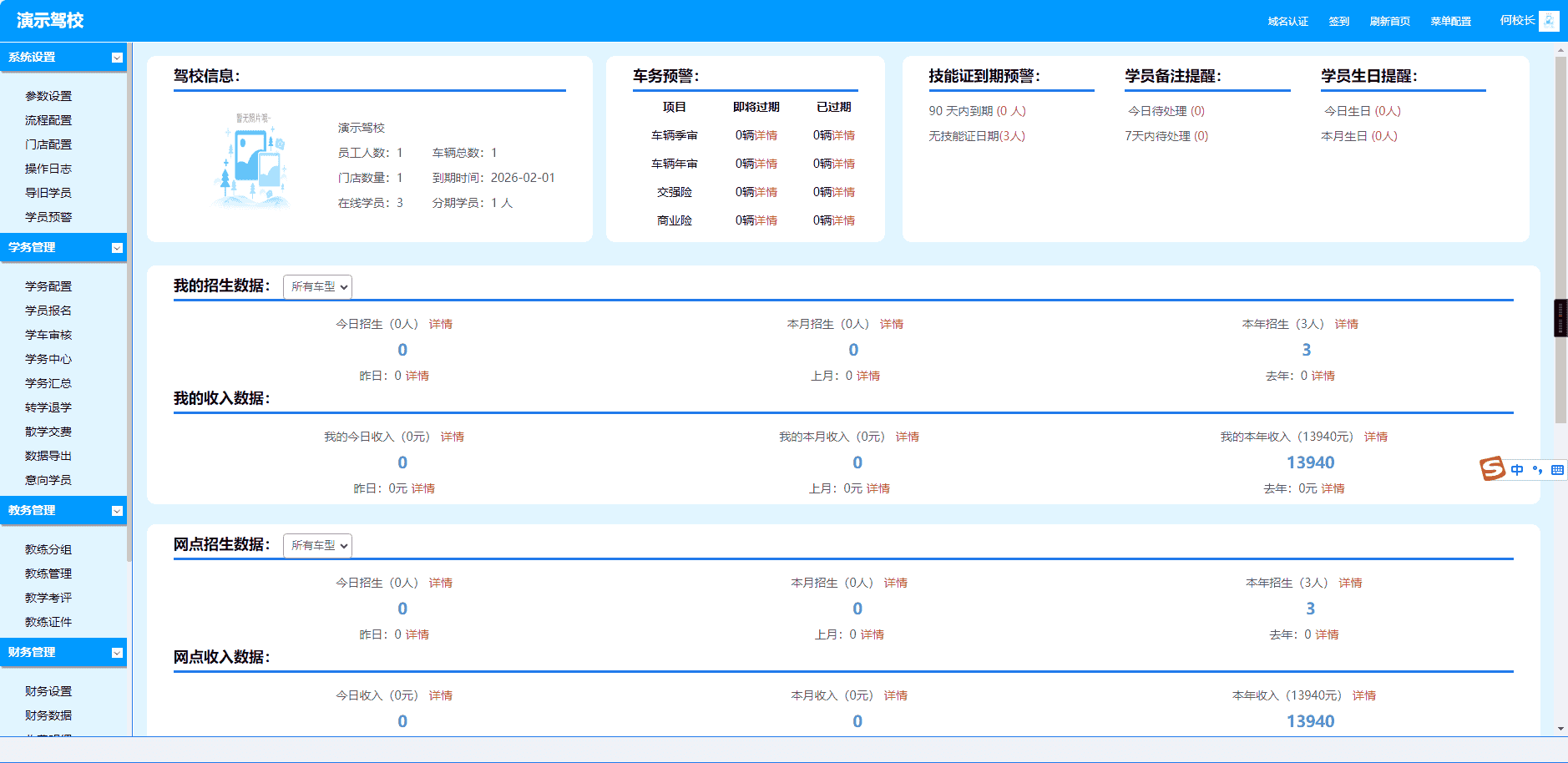 驾校培训管理系统打破传统驾校管理系统的局限性,突破性的开创学车流程的自主配置,全力协助驾校真正实现转型升级,实现管理的更新换代,全力协助驾校打造自己的大数据,让驾校成为驾培领域新时代、新环境下的商业赢家!面向驾培管理行业的专业办公管理系统,管理系统以总校、部门、文员的形式对驾校的管理线进行布局管理,所有操作员拥有当前网点的操作权限,同时也拥有所跨网点的同等操作权限。主要功能有学务、教务、车务、行政、仓储、财务、考评及微信公众号对接模块,其中将学员学车的过程以流程的模式进行管理,驾校可以根据自己的需求自主配置流程。