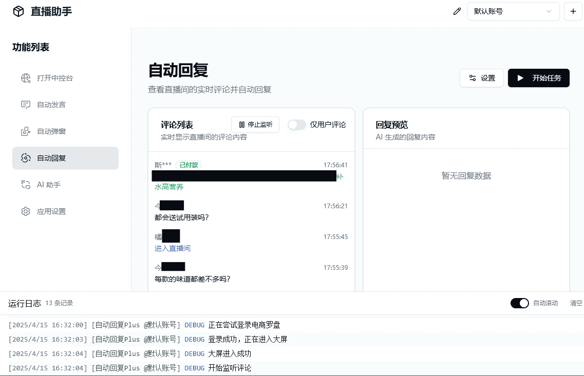 💃 AI 自动回复:实时监听直播互动评论(包括进入直播间、点赞、关注、加入品牌会员、加入粉丝团、下单信息等)、自动生成回复内容(仅限抖音小店/巨量百应)