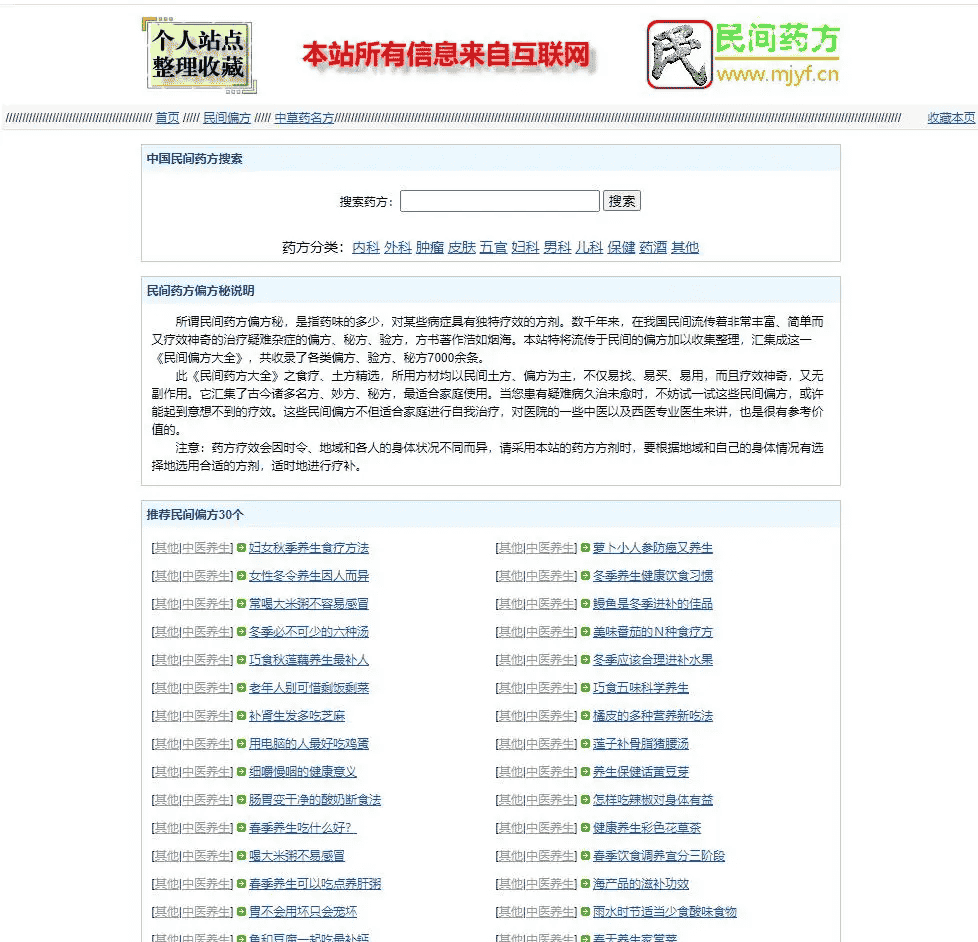 民间药方偏方网整站源码带数据,php版,不需要数据库,数据文件在dat数据格式的文件里,内容包含偏方和药方两部分,有搜索功能!可以结合其他的程序做成比较大的网站!