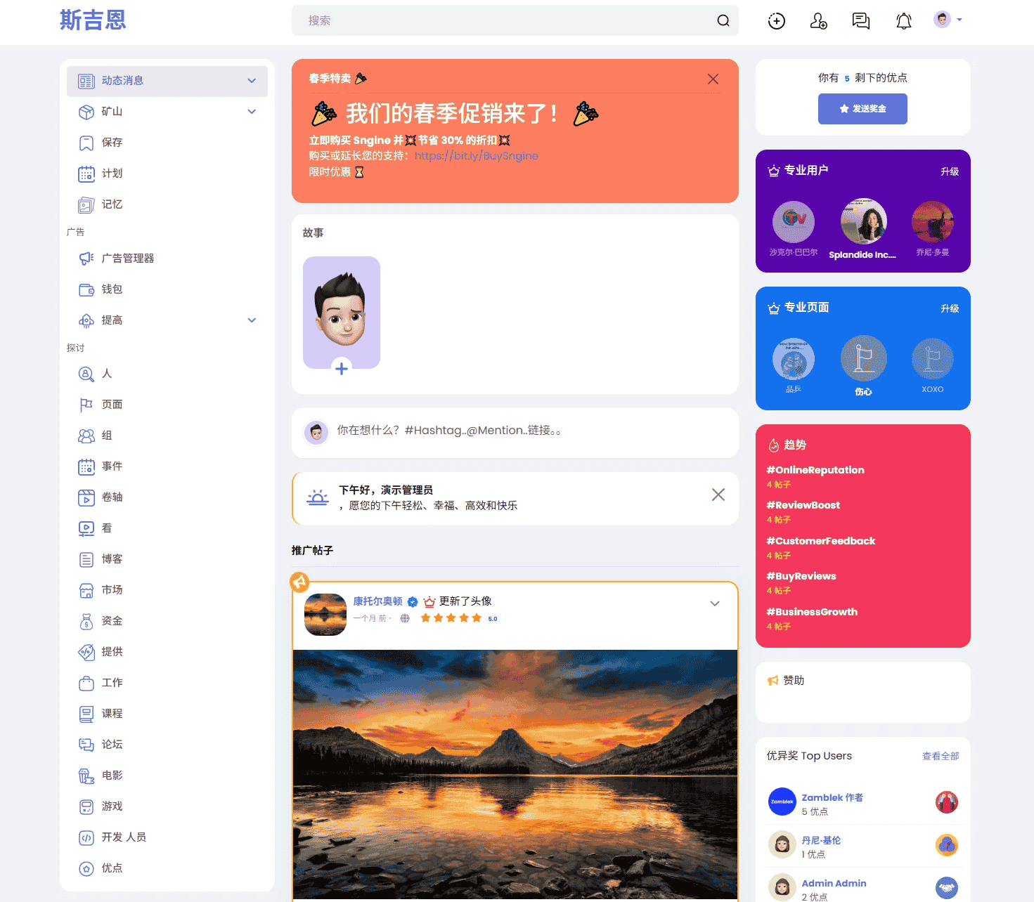 Sngine 4.0.4是一款海外社交平台的PHP源码,包括多语言支持、短视频和博客订阅等特性,类似推特的操作方式。用户可添加好友、关注、分享内容、接收通知,支持YouTube、Vimeo等链接分享,还有隐私设置、验证徽章、实时搜索、表情符号、照片图库等功能。此外,系统提供管理工具,用于管理用户、页面、评论、聊天、群组等,并具备SEO友好性、响应式设计及缓存系统以提升性能,如果不知道什么样可以参考【推特】,喜欢的自行部署吧!