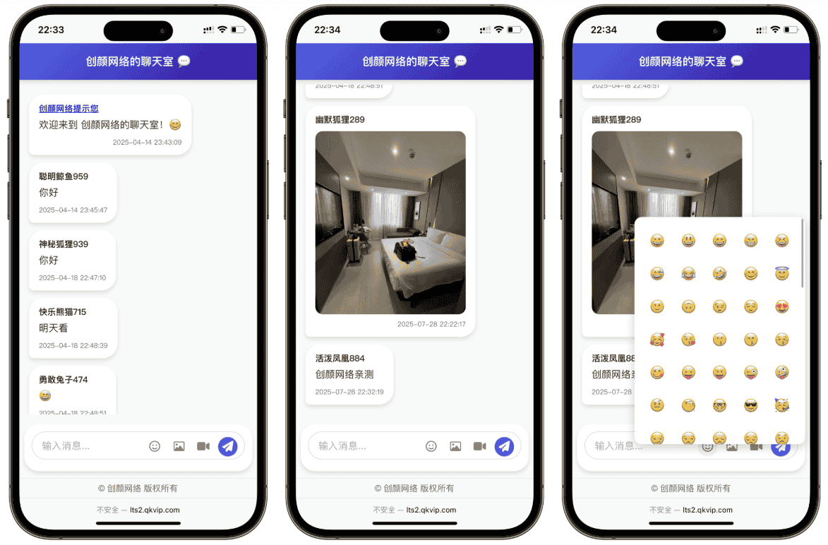 一款在线多人实时聊天室系统,支持表情包、图片、视频发送,支持每次发送消息随机用户名,无需数据库,无后台