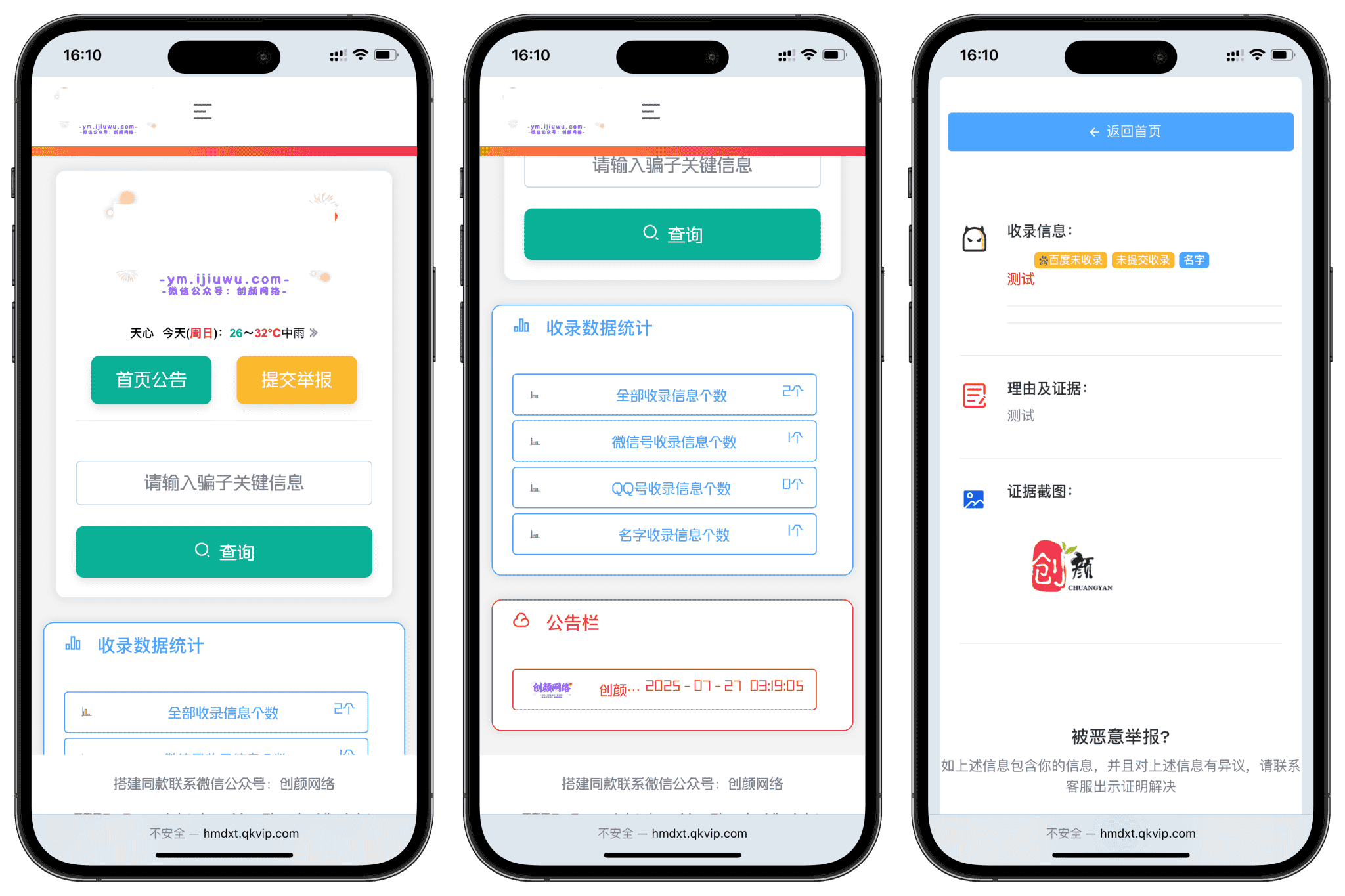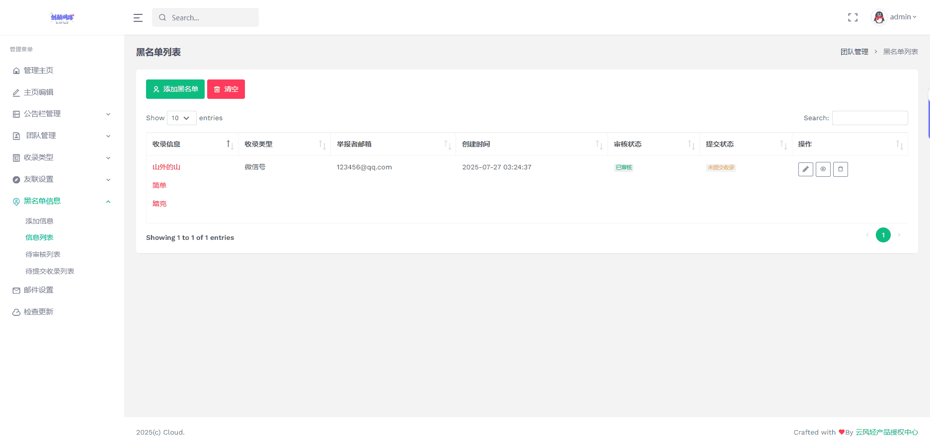 一款开源的黑名单举报查询系统,系统支持多种方式录入黑名单信息,可手动添加黑名单类型,适用于防诈骗查查询