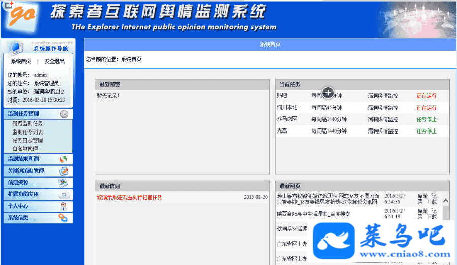 探索者互联网关键词策略舆情监测预警系统 v2.0 源码根据关键词策略对指定的网站、论坛、贴吧、微博、微信公众号文章进行扫描和源码分析,同时可抓取特征号码,并通过系统界面、邮件、短信三种模式进行舆情预警,并可提供多种图形化舆情分析。同时系统支持多层级部门和多用户定义,部署一套系统可为不同部门提供独立的舆情监测服务,是低成本、高效率、高精准的互联网舆情监测解决方案默认高级管理员帐号与密码均为 admi