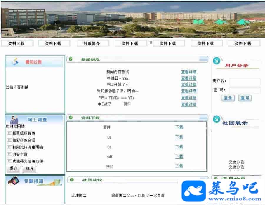 8、通知公告;网上调查、用户登录;社团展示;使用信息;专题报道;活动图片展示等功能