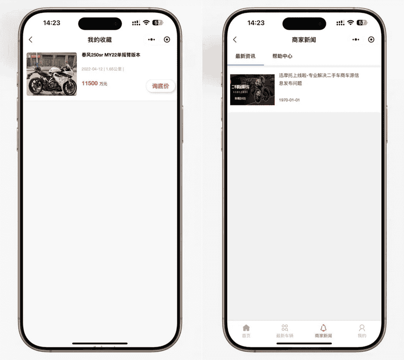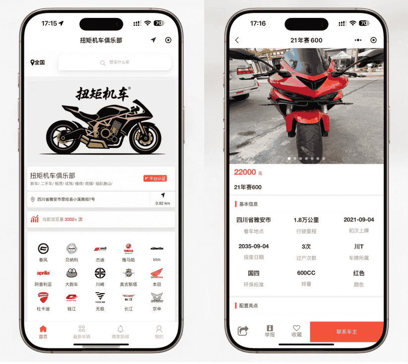 主要功能模块: 店铺展示、车型管理、摩托车信息发布、用户联系