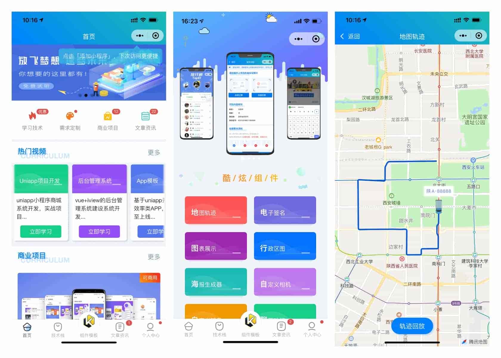 它使用了最新的前端技术栈,完美支持微信小程序,包含功能:自定义TabBar与顶部、地图轨迹回放、