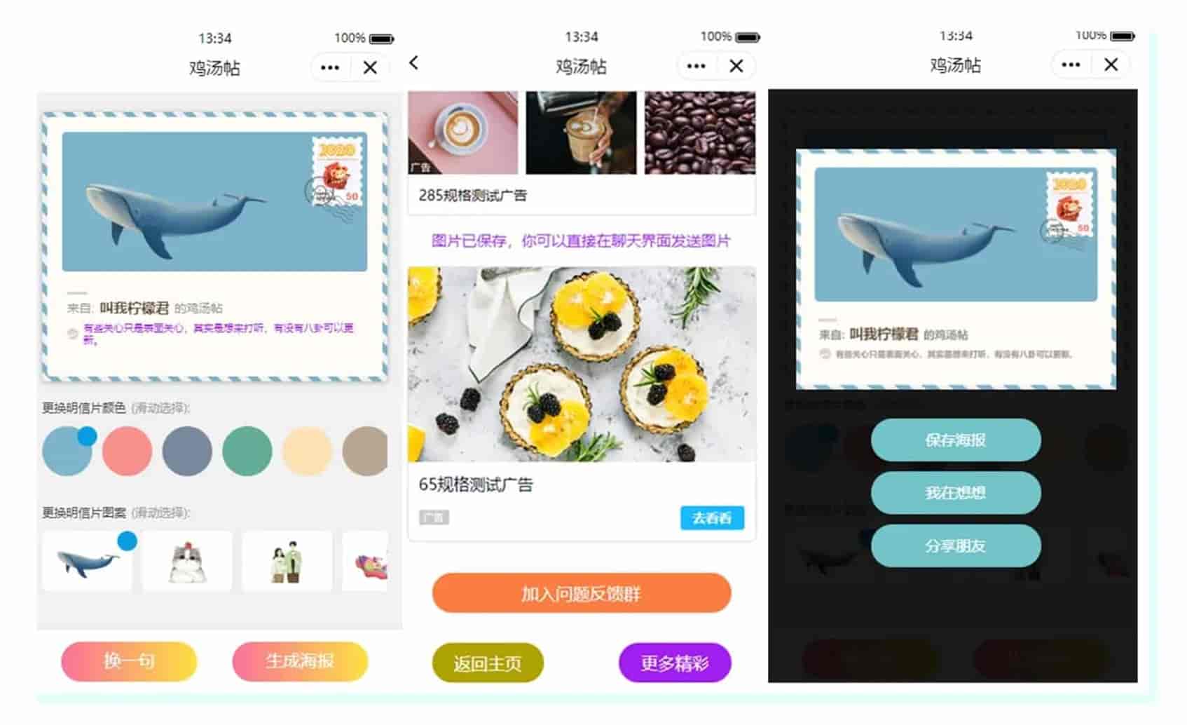 比如保存完成页面和分享完成页面已经用户通过分享卡片点击后进入小程序的界面,都做了比较合理的设计,