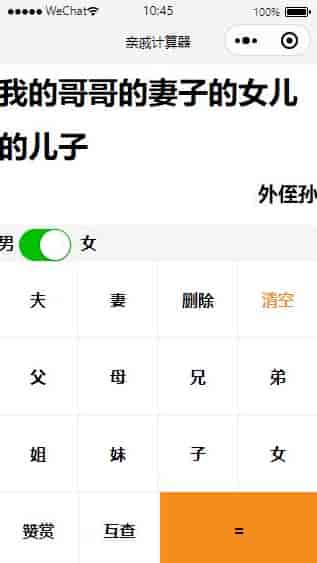 这是一款很实用的小程序,可以在输入要查找的关系以后,就会自动算出亲戚的称谓,逢年过节遇到三姑六婆,避免叫不出口的尴尬,帮你轻松搞定亲戚关系。安装说明:该小程序为云开发,不需要服务器和域名即可搭建,下载源码后直接导入微信开发者工具既可。