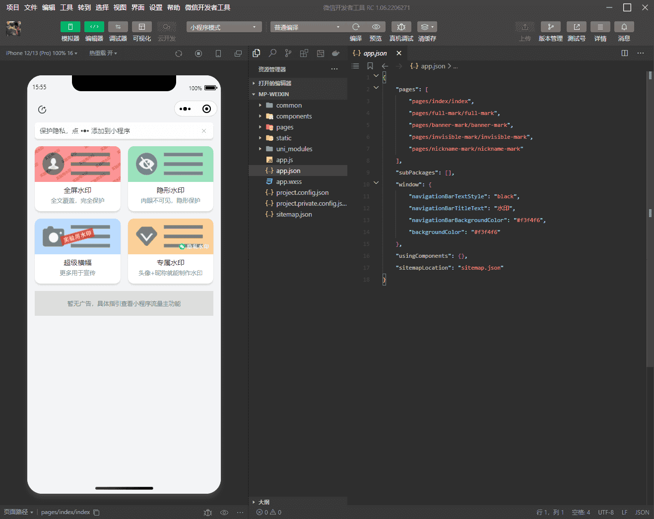 源码描述本款小程序用于制作水印,支持多种水印形式,并且支持流量主接入,纯前端,可嵌入任何项目。小程序支持从聊天记录选择文件、相机拍摄、直接选择文件,支持白底、黑底的隐形水印,制作完成以后,通过增加蒙版方能看到水印。