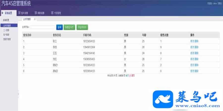 2.业务员管理(增删改查) 业务员就是卖车的表设计 员工编号 员工名 年龄 性别 销售次数(在后面的贷款办理或者全额付款模块每增加一条记录 记录中所对应的业务员 这边给这个业务员销售次数自动增加1)