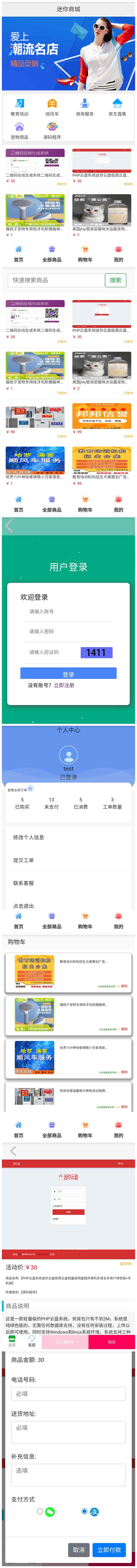 源码描述本套系统是迷你版的商城源码,主要在手机端使用,采用HTML5技术开发,可以完美适配各种移动设备,以及iOS和Android系统,没有太多的复杂功能,操作简单而且非常实用。系统虽然是极简版本,但是商城功能一样都不会少,可以出售实物产品,或者虚拟资源,发货形式是手动发货,内置标准的易支付接口,可以在线提交工单,全面支持网络图片,非常适合个人与企业使用。