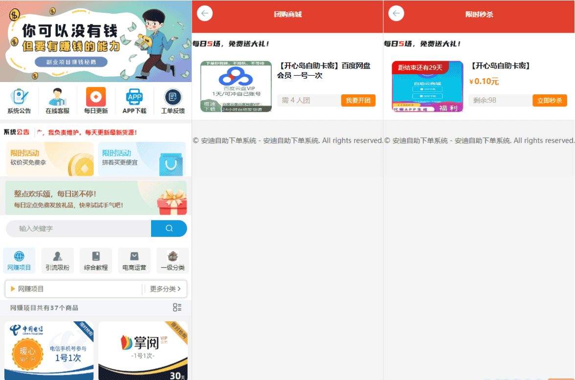 彩虹自助系统二开新增团购、砍价、秒杀等功能
