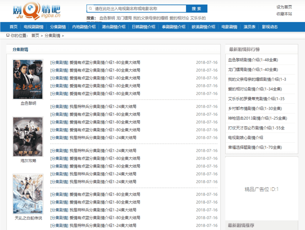 帝国CMS7.5剧情介绍模板,仿制剧情吧网站的风格。该模板并非用于直接播放电影,而是用文字描述剧情,同时包含手机版。本站免费分享供站长学习研究使用。采用伪静态技术,无需生成HTML。出于美观考虑,自带数据仅供本地环境下浏览。