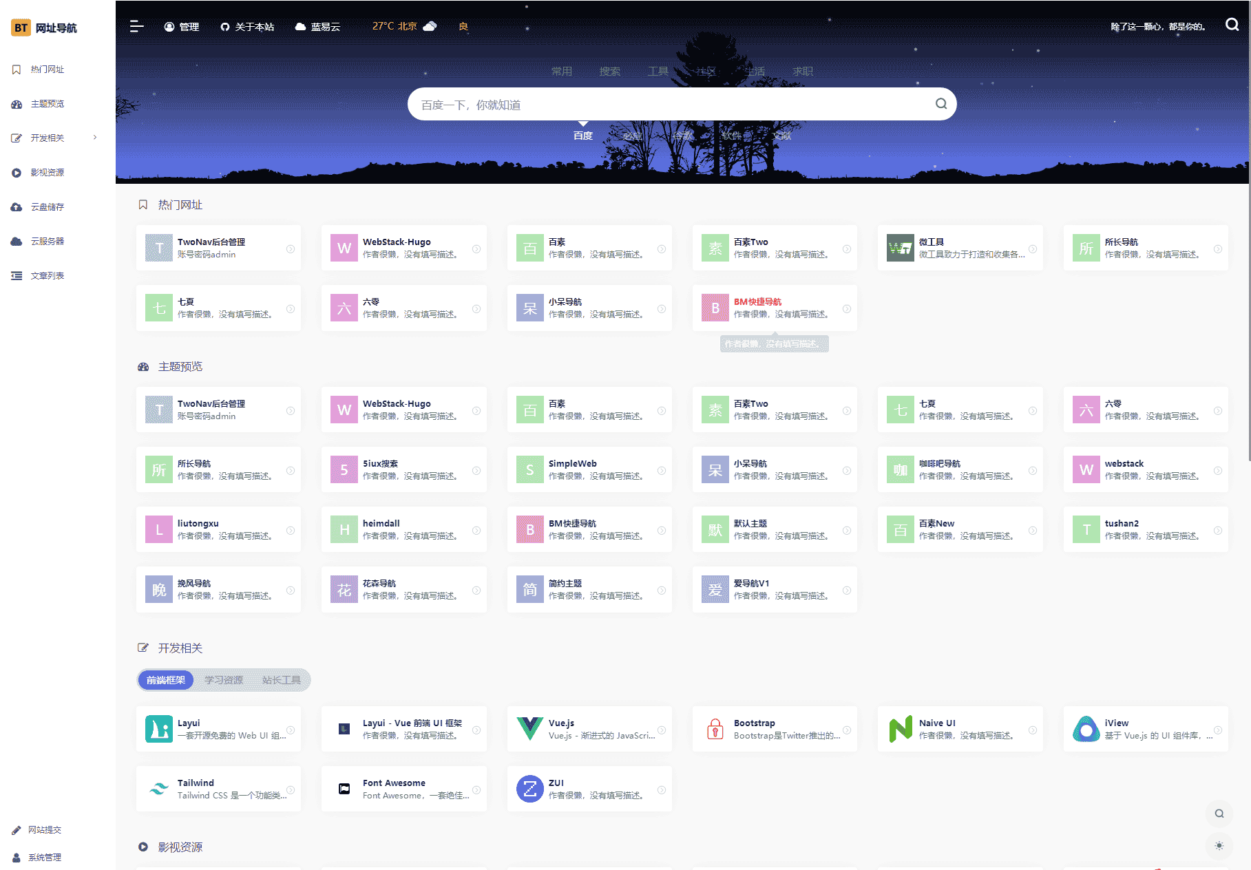 介绍:已去授权,最新开源解密版。TwoNav 是一款开源的书签(导航)管理程序,使用PHP + SQLite 3开发,界面简洁,安装简单,使用方便, 基础功能免费。 TwoNav可帮助你你将浏览器书签集中式管理,解决跨设备、跨平台、跨浏览器之间同步和访问困难问题,做到一处部署,随处访问。