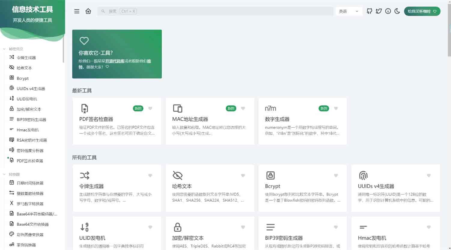 IT Tools是一个免费且全面的在线工具集合,为开发人员和IT工作人员提供了极其实用的工具。目前,收录的工具类型包括加密货币、转换器、网络工具、图片视频工具、数学工具等等。这个在线工具集合不仅提供出色的用户体验,而且还是开源的。