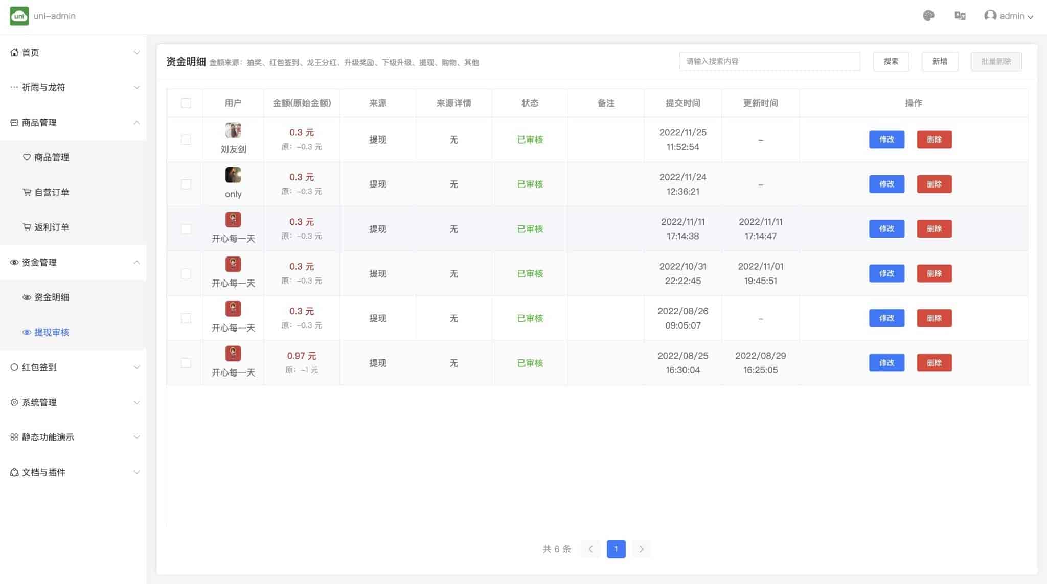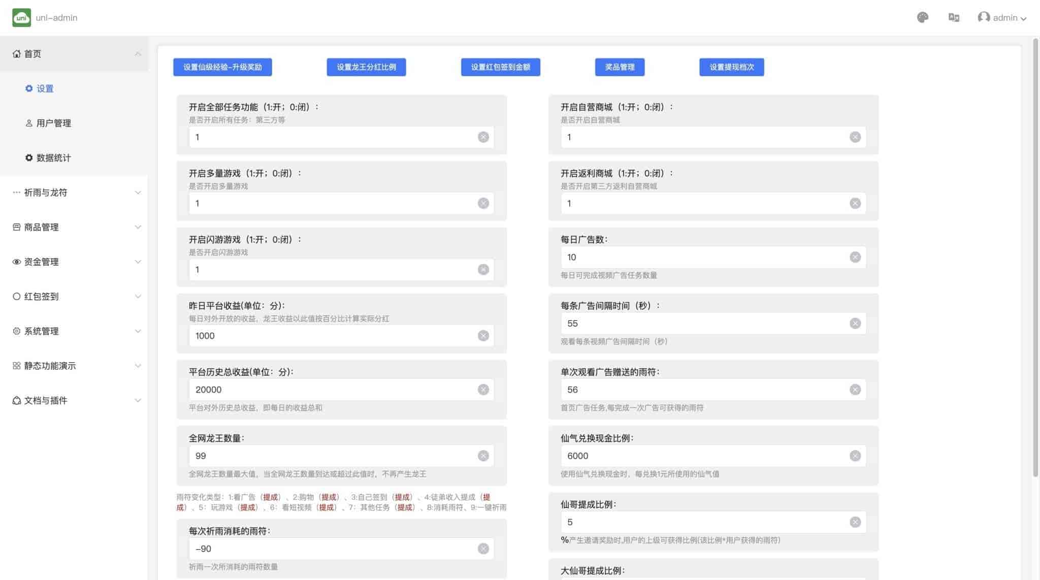 源码描述这是一款任务网赚APP源码,全开源无加密,基于uniapp+unicloud框架实现,功能涵盖养成、广告、商城、升级、任务、分享等多个方面,共有四个端口:安卓APP、管理后台、官方网站和分享网站,本套源码比较复杂,搭建部署需要一定的技术能力。