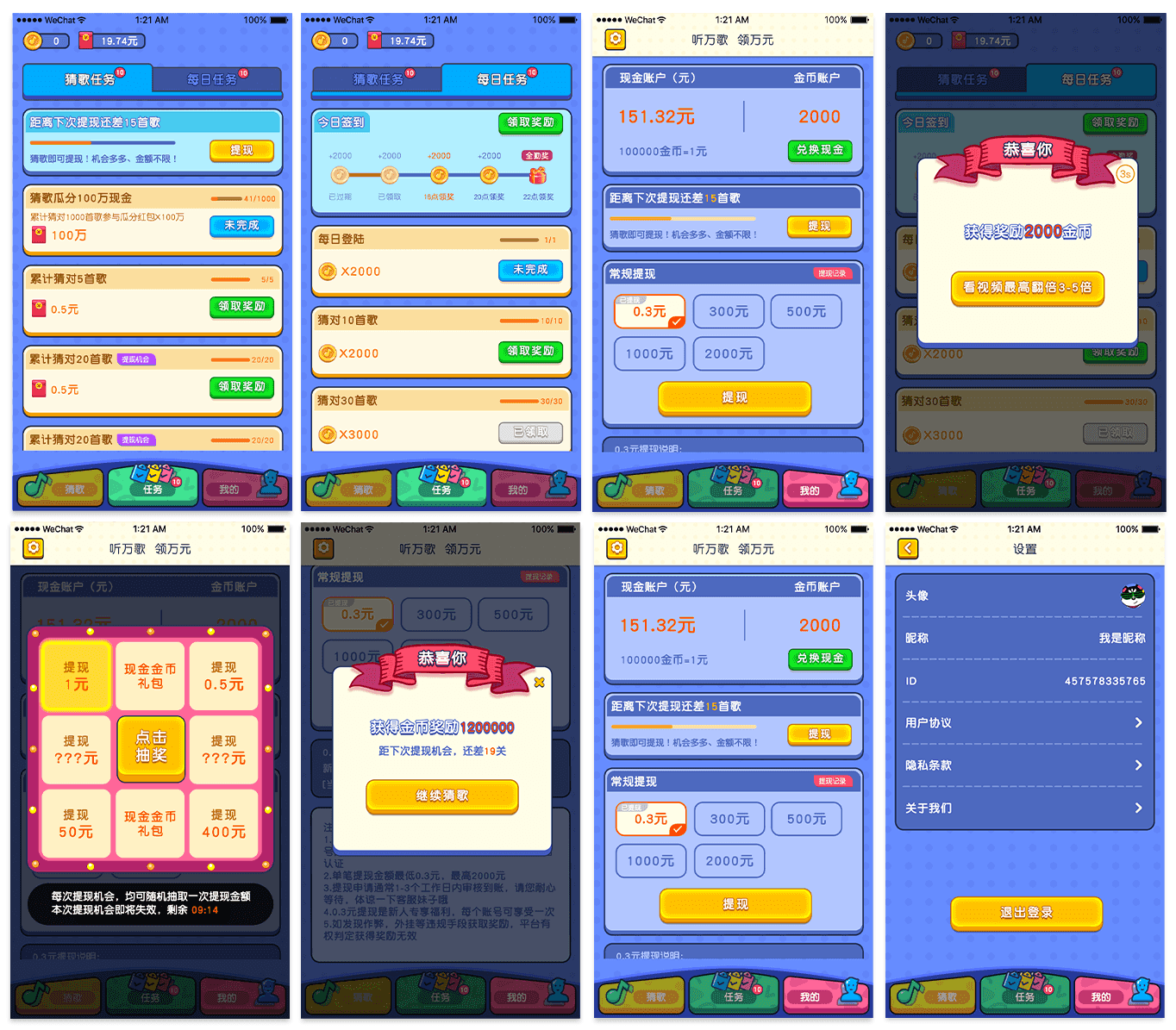 进一步扩展:在游戏中,每猜对一首歌曲,系统会显示连对,而连续猜对将会获得更多奖励。同时,玩家还可以通过观看激励视频广告获取不同倍数的奖励。如果玩家猜错歌曲,通过观看激励视频广告可以复活一次,否则连对奖励会被重置,玩家将无法获得任何奖励。当达成一定条件时,玩家可以从游戏现金账户提现不等额的现金,为他们提供了更多的游戏乐趣和激励。
