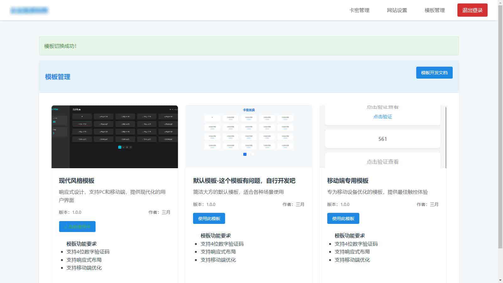 卡密管理和验证,多模板支持,响应式设计,验证码保护,防刷机制,简洁的用户界面,