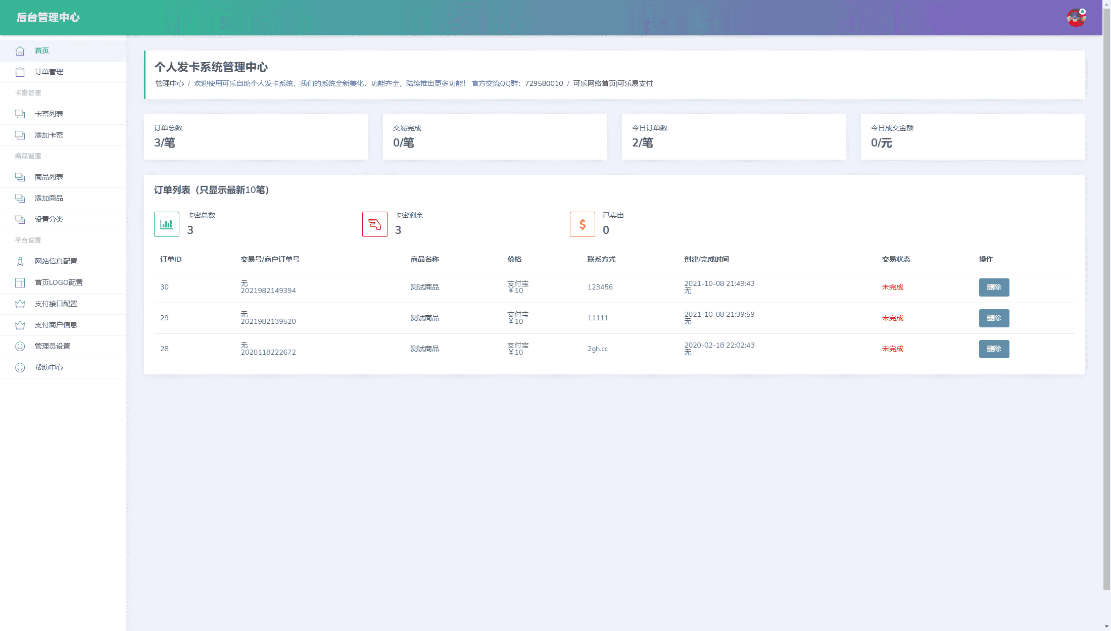 可乐个人发卡网目前网上用的最多的应该就是这一套了,但是很多地方都是加密过的,有些还需要授权。这个版本已经全解密且无授权,支付重新对接了第三方支付,PC和wap页面漂亮简洁,功能实用,订单管理,设置分类,商品上新,卡密提取,商品信息,网站logo配置之类的都在后台就可以直接搞定,不用像之前翻改代码。