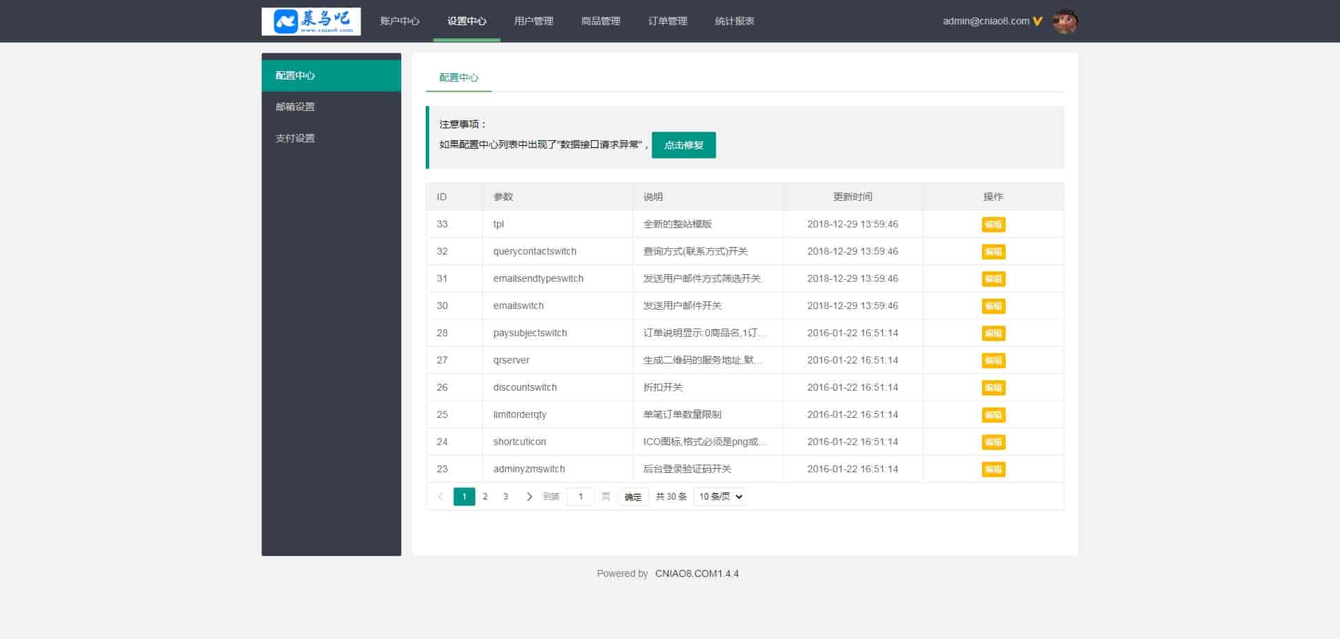 包含设置模块、订单模块、商品模块、配置模块、卡密导入导出等;后台可对首页模版进行切换,验证码、注册、登录、找回密码进行后台开关控制;