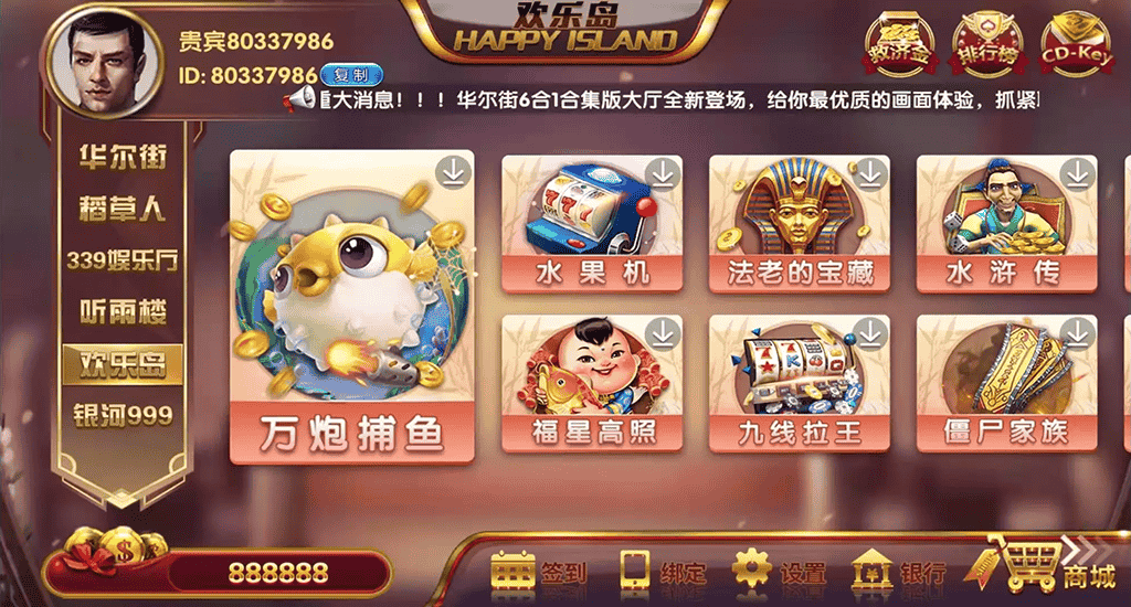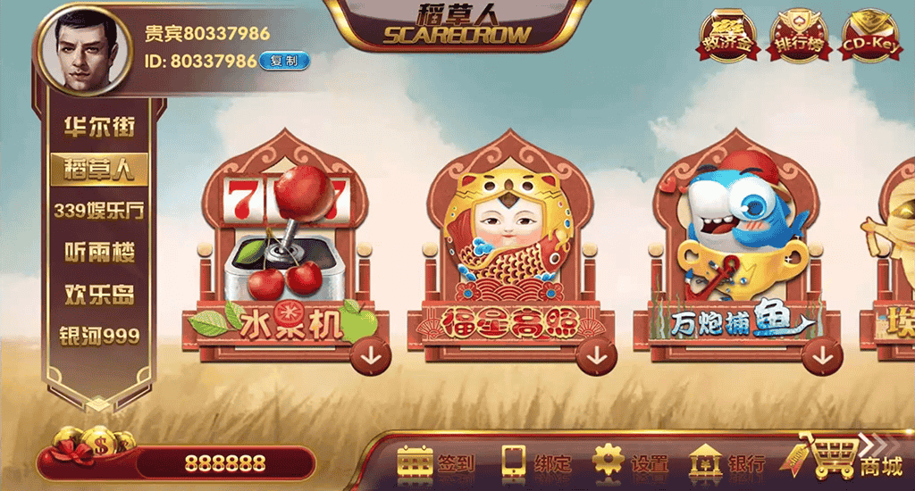 华尔街基于佳游二次开发制作,电玩城含有6种合集大厅,分为华尔街、稻草人、339娱乐厅、听雨楼、欢乐岛、银河999系列UI风格,运行设备支持PC电脑端、app手机安卓端、苹果端,玩家进行游戏可以使用游客、以及帐号登录。