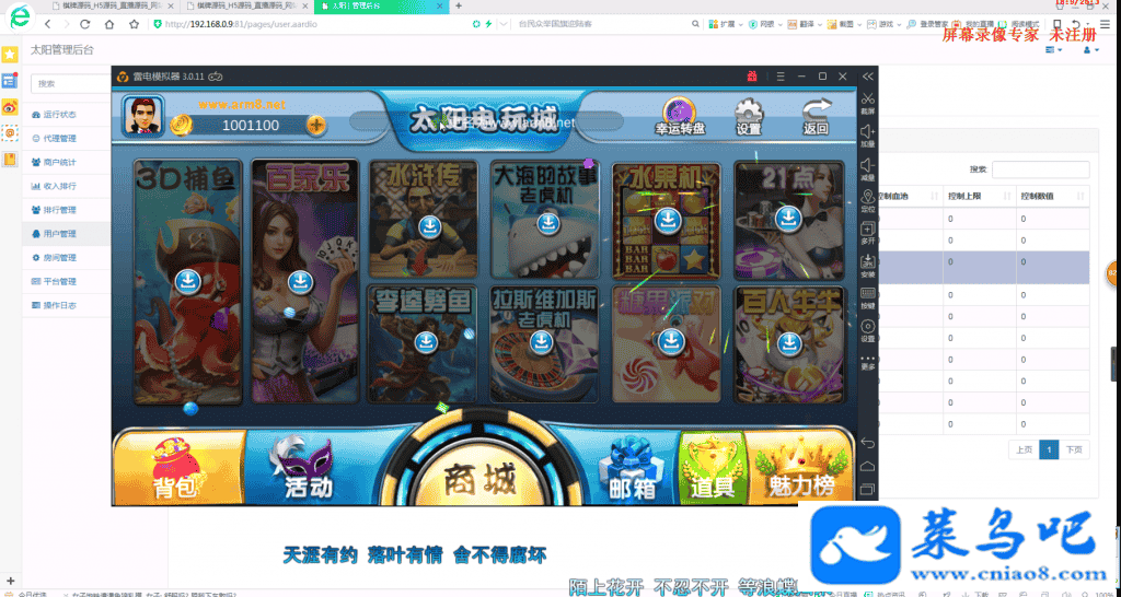 太阳电玩城组件,前端为U3D的,后台WEB进行控制,画面精美,游戏流畅,有1:1的感觉,带有滚动彩金。内带子游戏:3D捕鱼、百家乐、水浒传、李逵X捕鱼、老X机、水果机、21点、牛牛。本套组件已含:WEB、服务端、数据库、手端。已测手端及IOS正常使用。