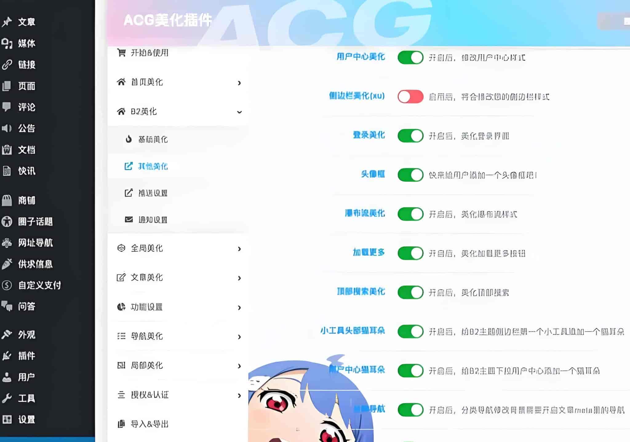 子比主题ACG美化插件内置功能开关100+,开源免授权