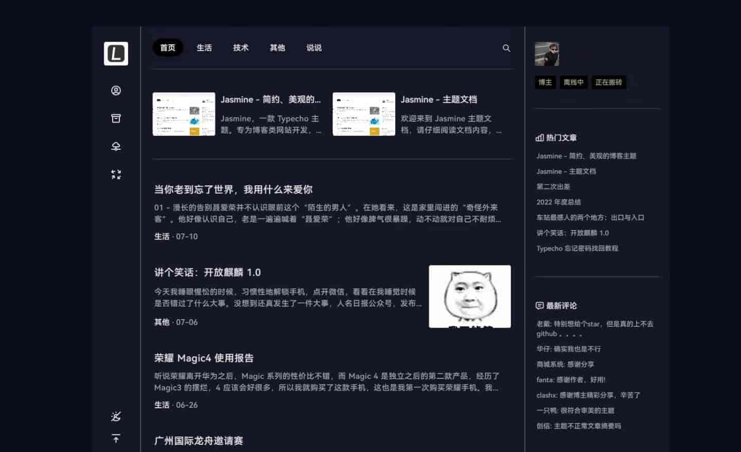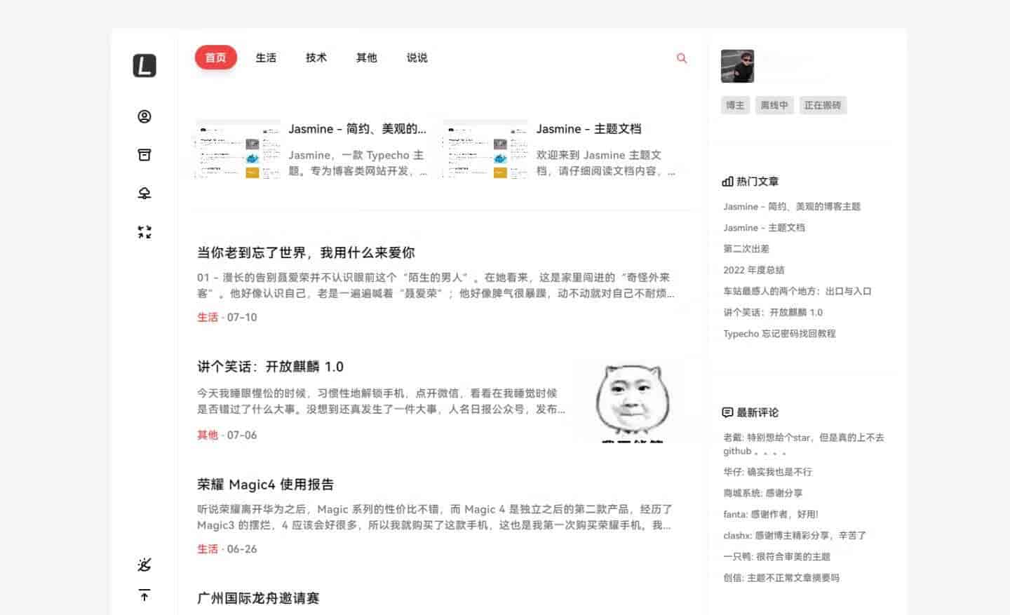 源码描述这是一款专为博客类网站设计的Typecho主题(Jasmine),以简洁为基础,力求展现出精致而美观的风格,并且进行了针对性的优化,包括SEO、夜间模式和代码高亮等方面,保证了简洁但不简陋的效果。主题亮点:针对SEO进行了优化,支持切换夜间模式,无需刷新即可跳转页面,内置说说功能,支持显示置顶文章,支持显示文章阅读量,支持评论区显示QQ头像,支持代码高亮,支持随机文章跳转,可设置文章缩略图,支持外观设置备份,等等。
