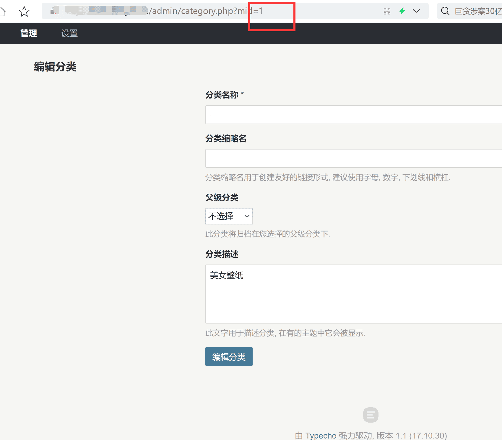 或者在Typecho后台编辑分类然后查看浏览器的网址,如下图: