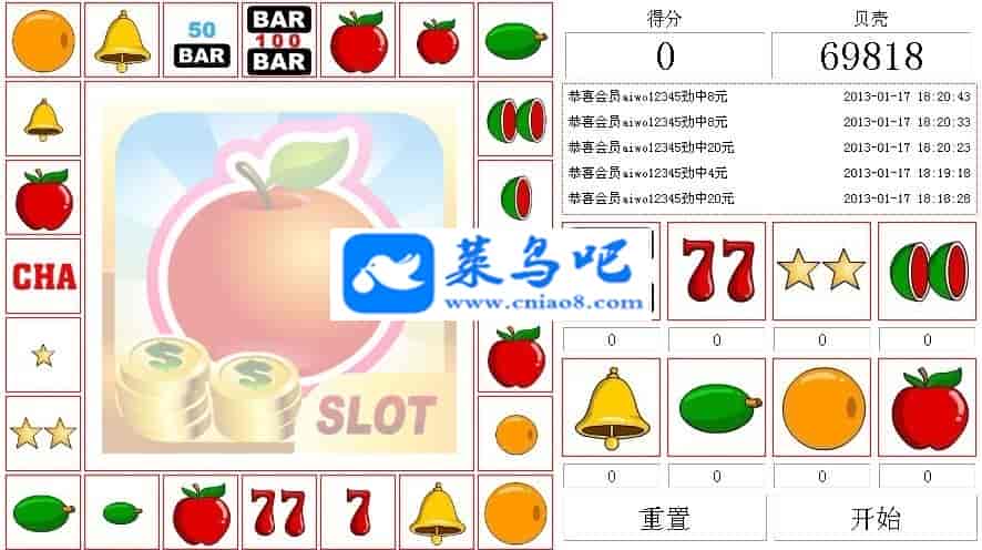 游戏中的物品有八种,分别为:苹果、西瓜、木瓜、橙子、铃铛、77、双星,这些物品又分为大小两种。还有BAR图标,分为3种。