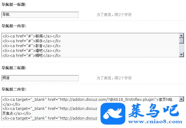 其他说明:导航是一个网站的重点,最直接的好处是让用户可以知道网站的主题,然后可以方便的访问每一个页面。但是导航又分主导航与二级导航,甚至三级导航等。二级导航一般显示在主导航下面,有层次关系。二级导航可以把网站的结构体现出来,并且重点栏目还可以重点标出。DZ后台虽然有二级导航设置,但是美观度不好,所以要自己设计一个,但是要修改模板,或设置导航栏广告,很不方便。而it618超级二级导航是插件的方式,只要安装了就会自动显示二级导航,并且还可以在后台直接设置导航的内容。