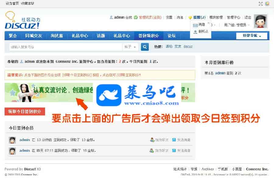 功能主要用于站内推广,签到是聚集人气的地方,签到的广告很快被会员阅读浏览。