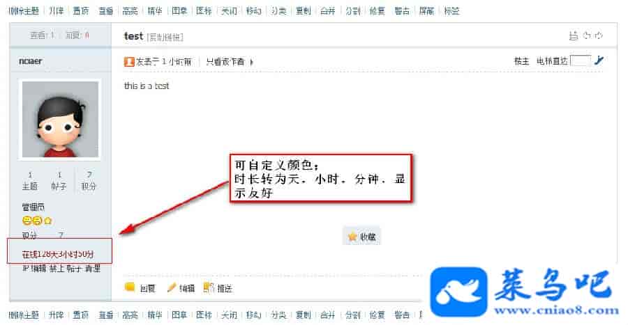 该插件会在帖子页用户资料下方显示用户在线时长。用户在线的时长会以十分友好的“*天*小时*分”格式来显示,并且可以自定义显示颜色,使之与网站无缝搭配,具体细节看截图。