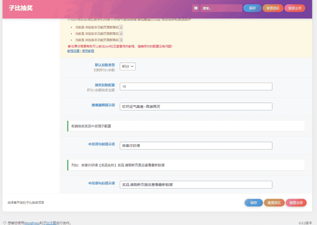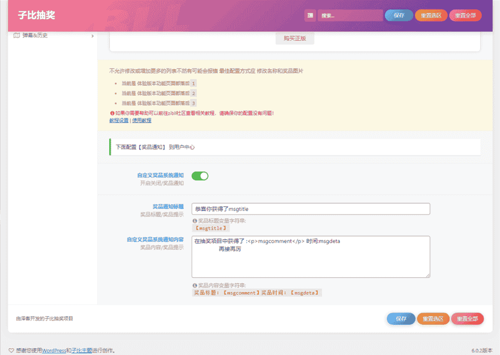 源码描述本款zibll转盘抽奖插件是开源版,具备多种自定义功能,首先,你可以自定义奖品,根据你的需求和活动内容,设置不同的奖品名称、图片或其他相关信息。其次,你可以自定义奖品的几率,通过设置每个奖品的中奖几率,你可以控制抽奖的公平性和概率分布,以满足你的抽奖需求。最后,这个插件还支持自定义通知,当用户中奖时,你可以通过设置通知方式,如弹窗、邮件或其他方式,及时通知中奖用户,提升用户体验和互动效果。