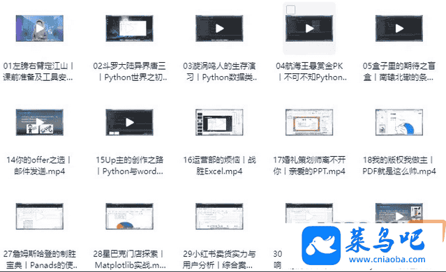 这是一套非常适合小白入门的Python编程课,专为小白定制的Python新手入门课程,30节实战精讲,内容包含Python办公自动化、Python爬虫、数据分析、数据可视化等Python必修课程,只要30天就能让你脱胎换骨,整个学习过程中有趣不枯燥,非常值得一学~