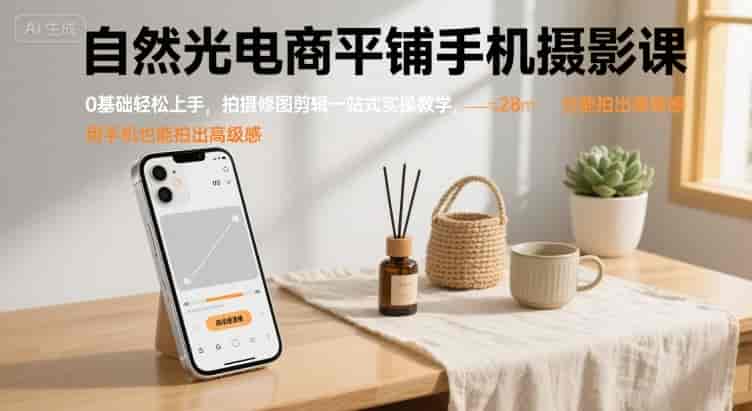 自然光电商平铺手机摄影课,0基础轻松上手,拍摄修图剪辑一站式实操教学,用手机也能拍出高级感