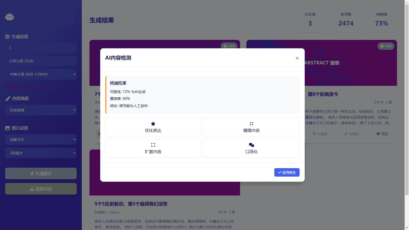 3. 系统会确保每篇文章字数超过300字,并避免内容重复